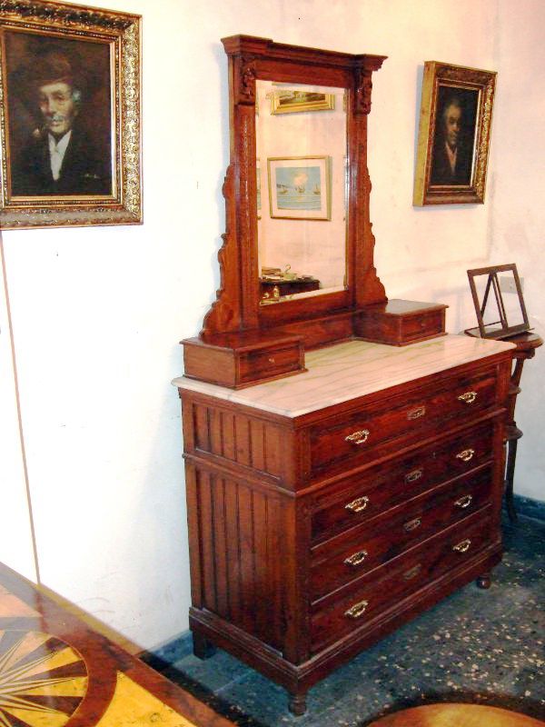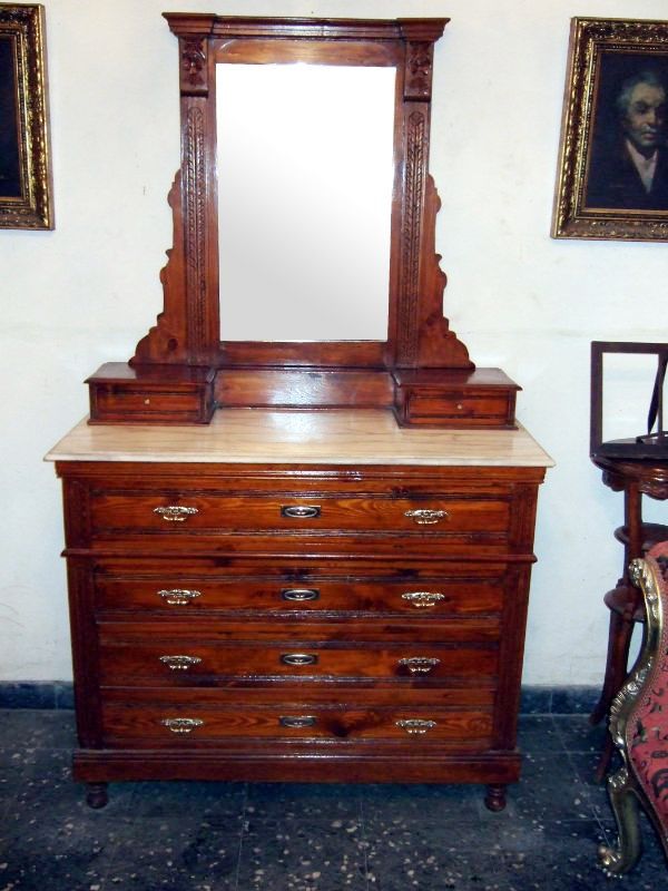 English style dresser and chest of drawers with a fine marble top and two small drawers attached to the mirror plus four big drawers in the lower part.