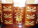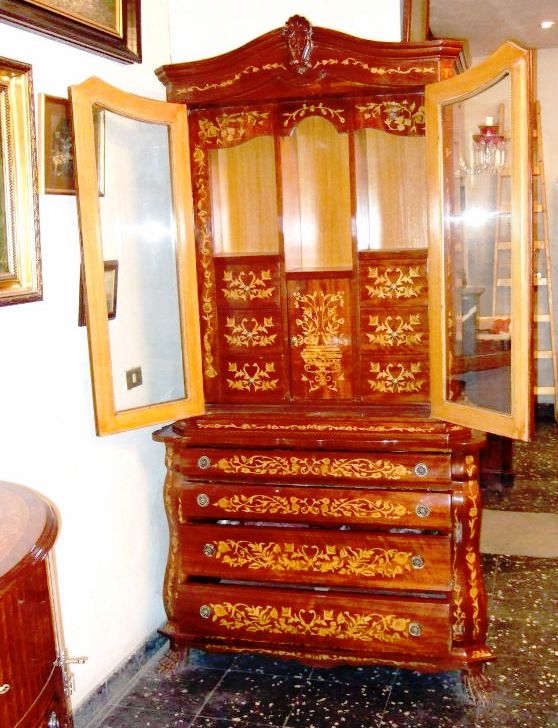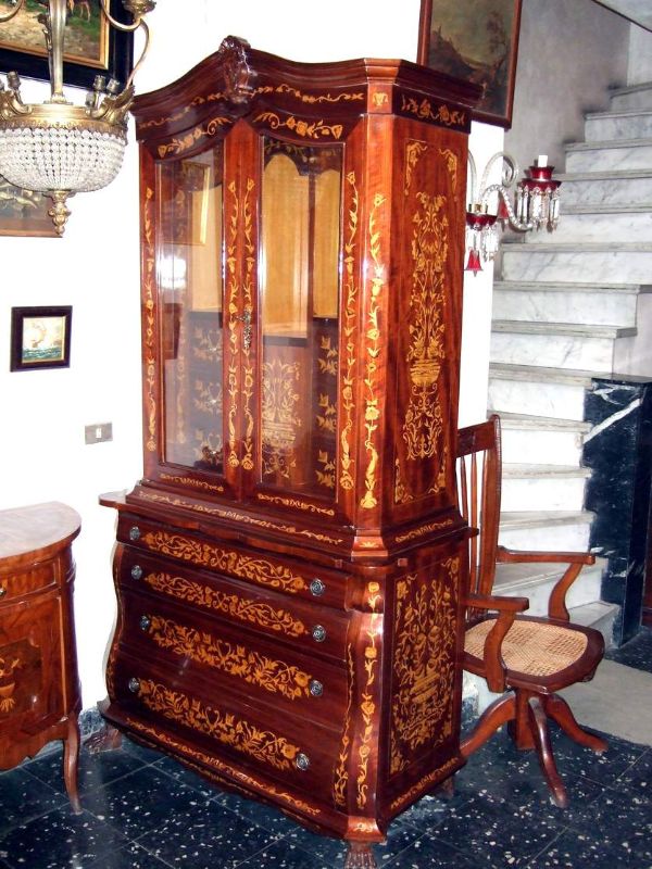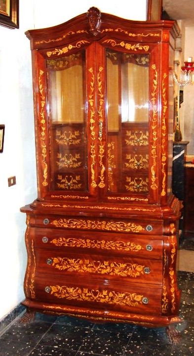 Elegant Chippendale style bookcase with skillful beautiful marquetry patterns with six medium size drawers inside the two glass doors and large four drawers beneath.