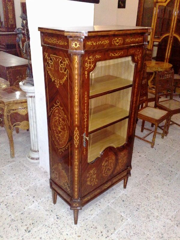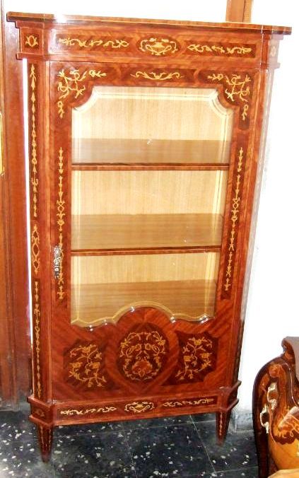 Beautiful Italian Style Bookcase / Vitrin with amazing marquetry patterns all over, with glass door & three shelves, highly finished inside out.