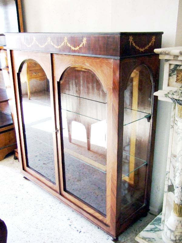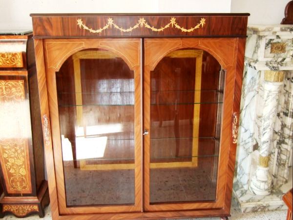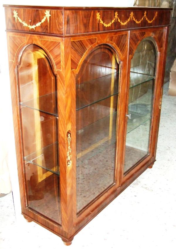 Italian Style Vitrin inlaind with palisander and walnut veneers and delicate marquetry floral pattern, with incised glass two doors, glass sides and two glass shelves.
