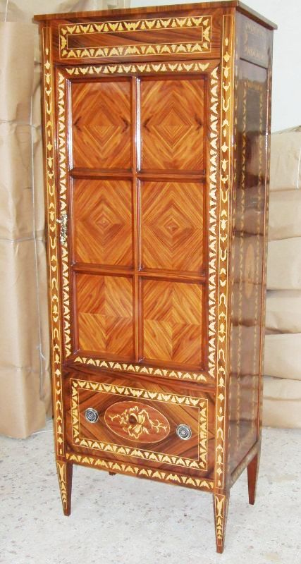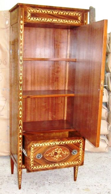 Italian style Bookcase inlaid with extensive marquetry patterns and beautiful veneer inlays, with two shelves & deep drawer.