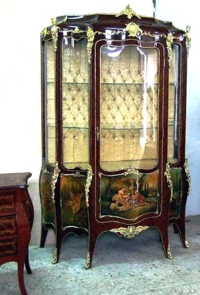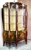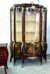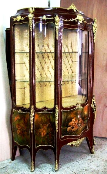 Louis XV style & Vernis Martin Vitrin ornamented with fine ormolu all over with highly hand painted scenes, upholstered on the inner back with fine matching gold fabric.