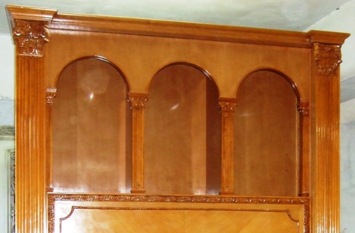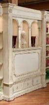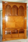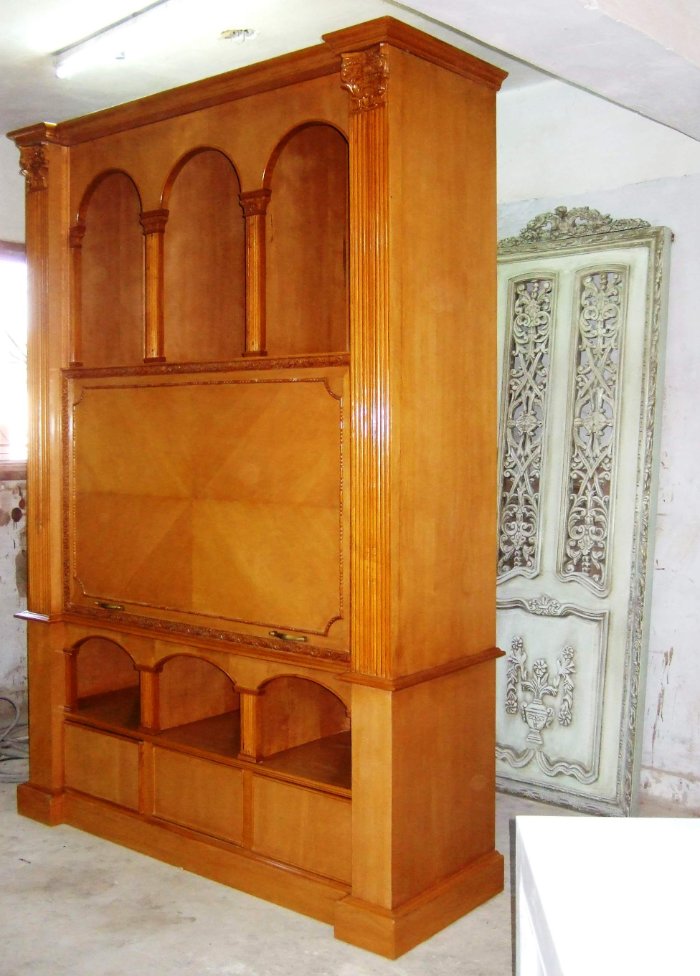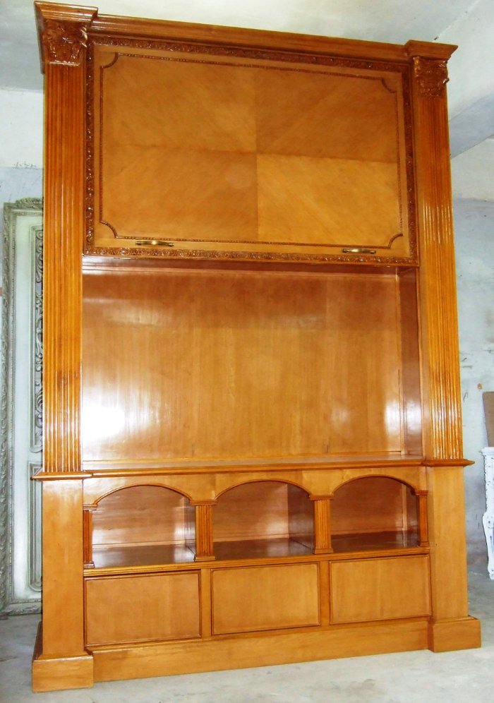 Large Italian Style library TV & wall media unit finished inside & outside, with manual lift housing a large LCD TV with six dome holes in the upper & lower parts to house library items or decorative artifacts. Finishing is per clients requests.