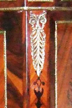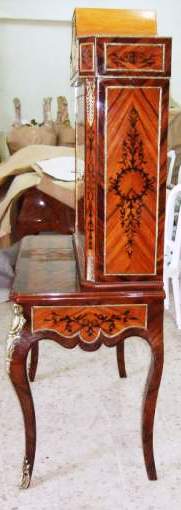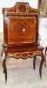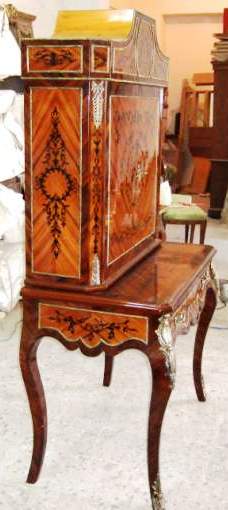 Ormolu mounted French Louis XV style bar cabinet, with a writing space ( bonheur du jour ), highly finished, hand painted, inlaid with the finest palisander veneers, the upper part with two doors, divided from inside into sections to house the wine bottles and glasses plus four small drawers, the lower part with one drawer, stands on cabriole legs, ornamented with ormolu all over the front and sides.