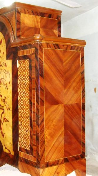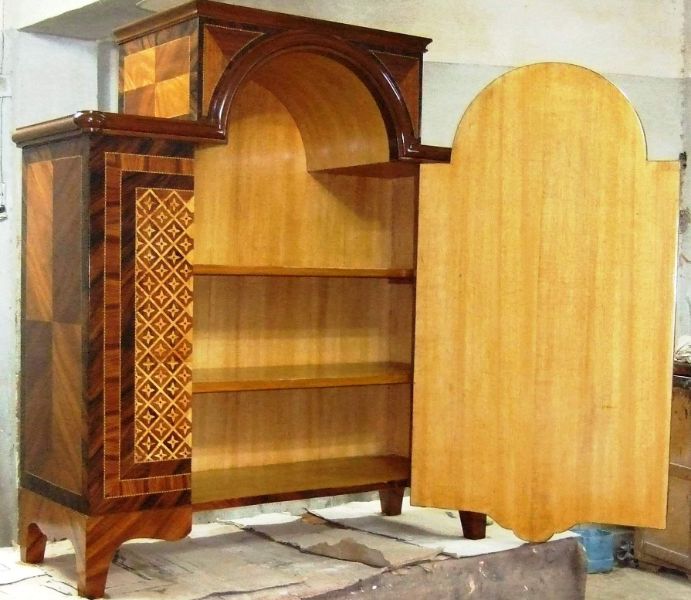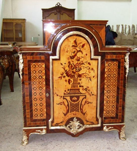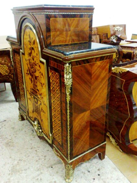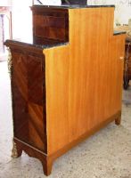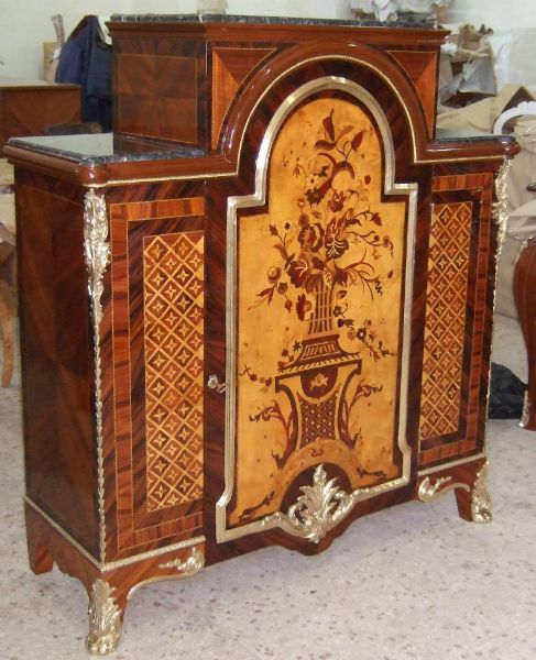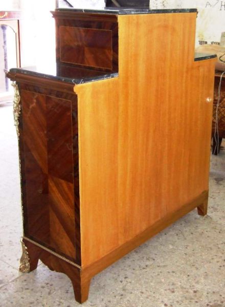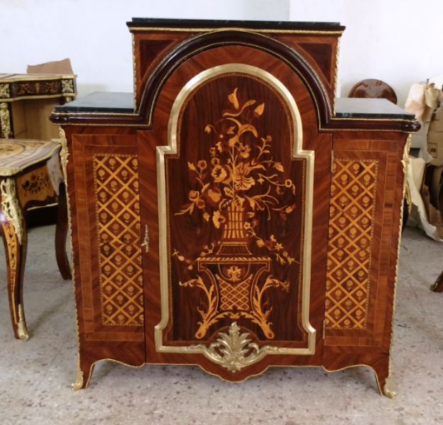 A fine Regency Style veneer and marquetry Meuble D' Appui after the model of Descotte & Fils, circa 1880, Paris, with central raised rectangular Portoro marble top flanked on each side by a lower marble top, over a conforming case centred by an arched cupboard door decorated with a basket of flowers on a pedestal, opening to a pair of shelves, flanked by two panels with trellis and flowerhead parquetry, the sides with plain panels, on hairy paw-cast feet.