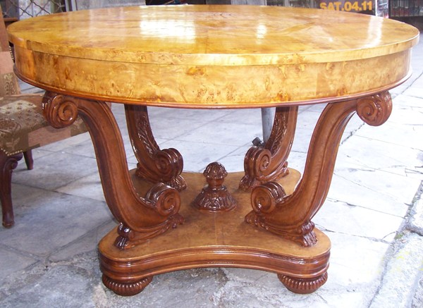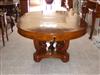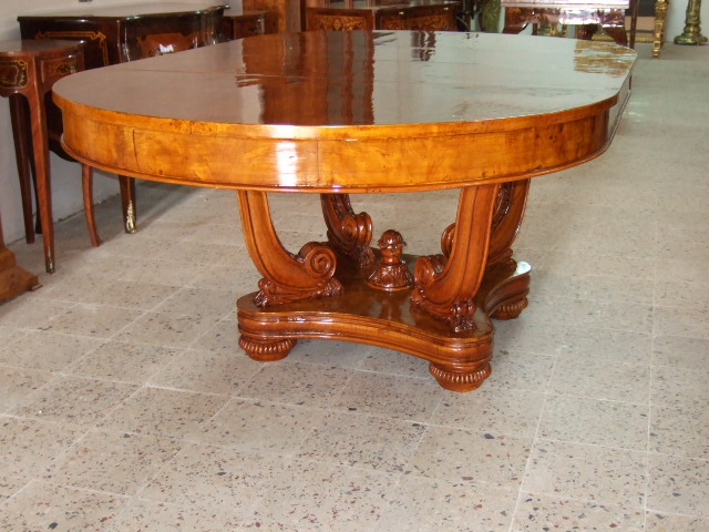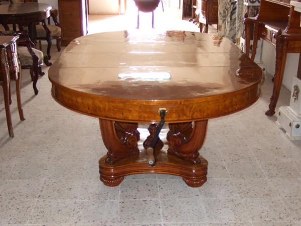 Art Deco style extendable round shape veneered Dinning Table with two panels added to be oval shape and mechanized arm to open the body.