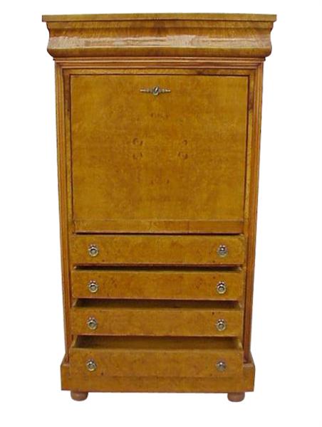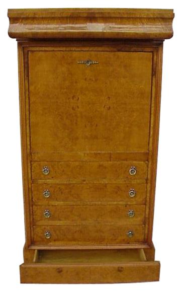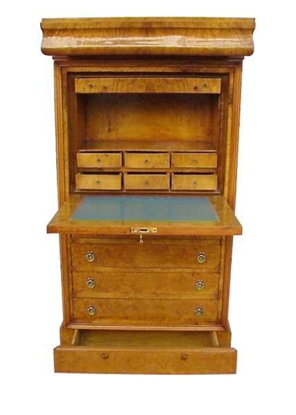 Useful and elegant office use Art Deco style Secretary with 13 drawers - upper and lower hidden large drawers - upper sliding door panel houses a space for a safe and large drawer plus six small drawers, the sliding panel is leathered with green leather, the lower part has other four large drawers.