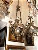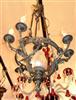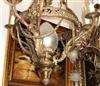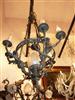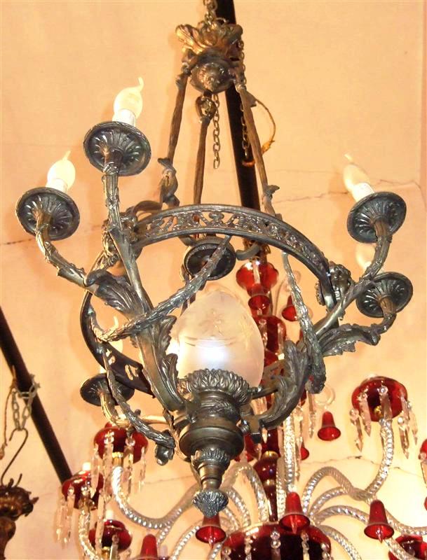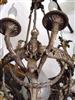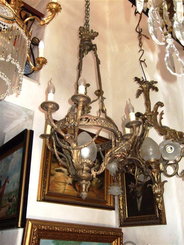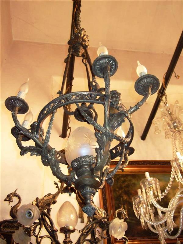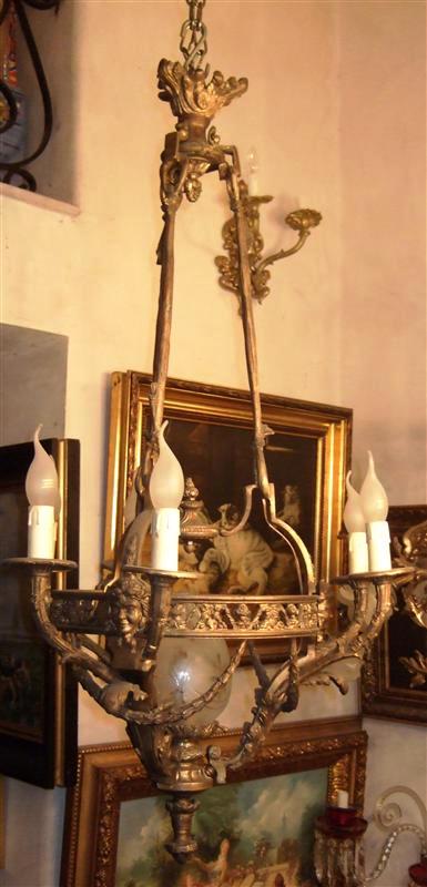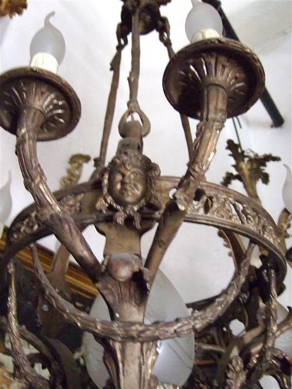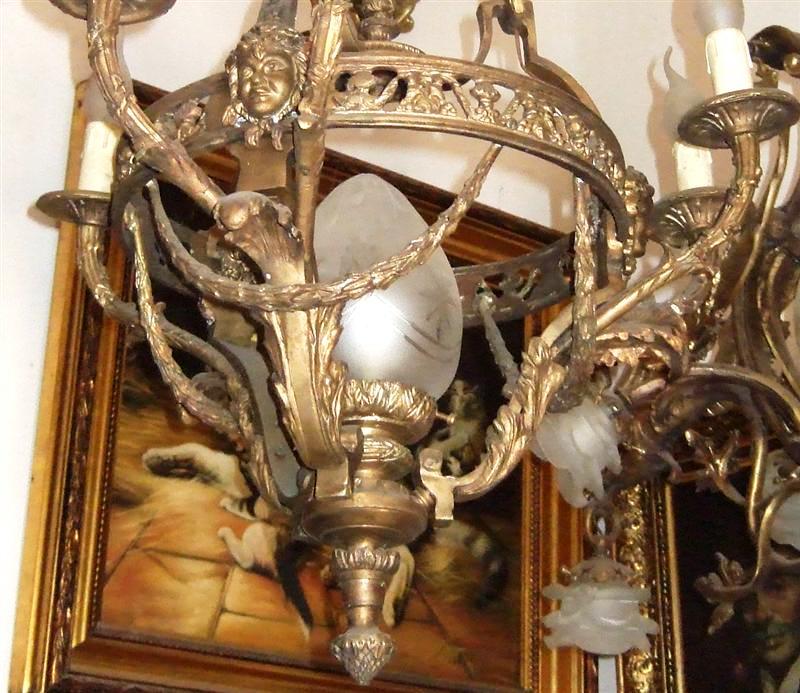 French Belle Epóque style handmade ormolu chandelier, six candle arms and a central egg shaped frosted glass shades bulb, acanthus leaves, ornaments of laurel wreath drapes and putto faces, with three extending supports in the form of drapes with tassels.
