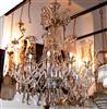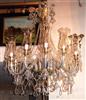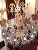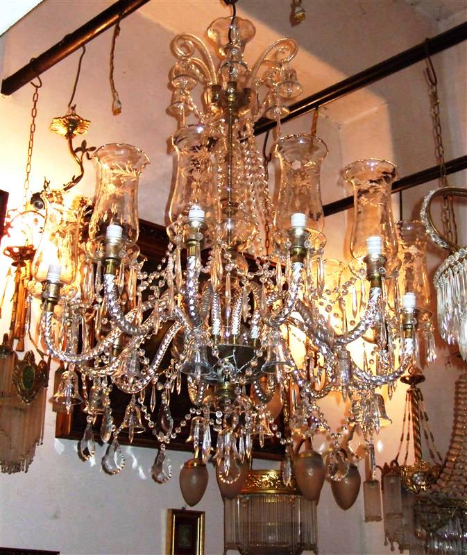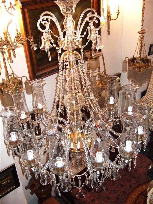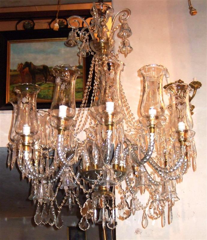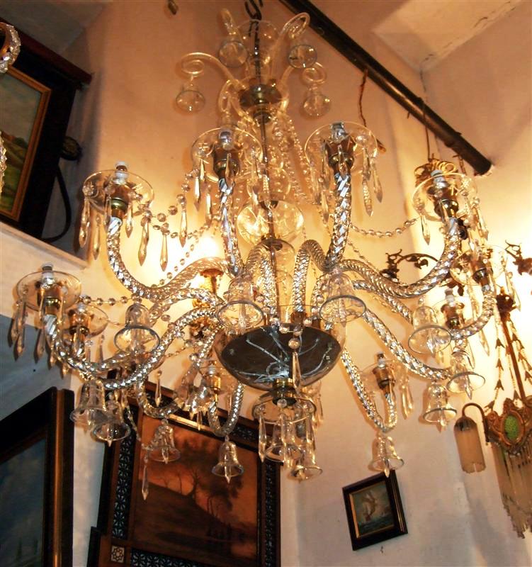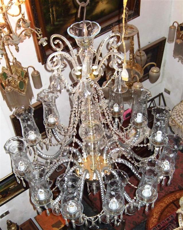 Handmade Georgian Style Waterford pure glass and crystal 12 arms and bulbs chandelier with ornamented glass bells, u-drop crystal, French pendant crystals, cut spears, yard of crystal beads and crystal bobache.
