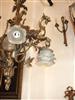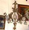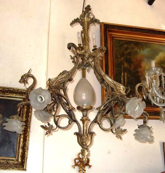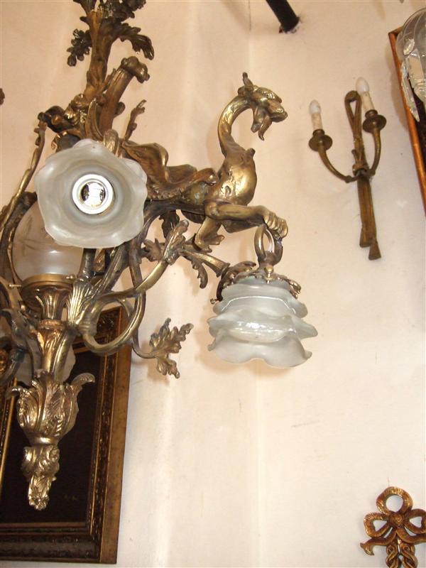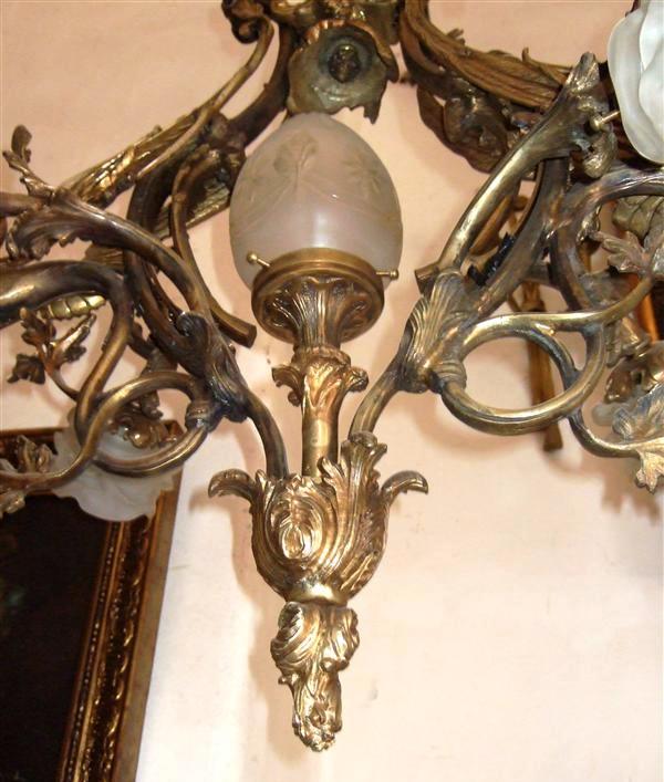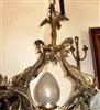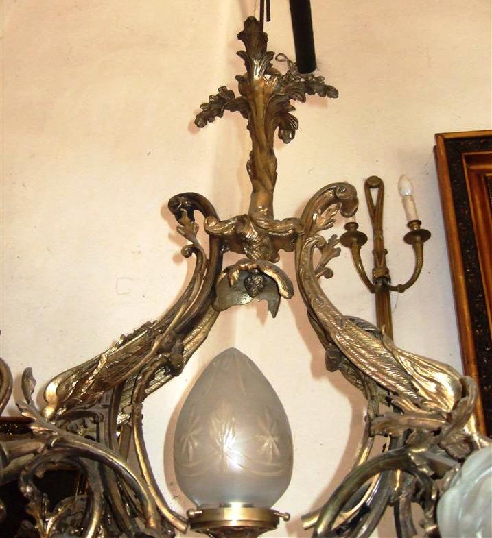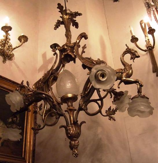 Unique French style ormolu chandelier, totally handmade, seven lights, a central egg shaped frosted glass shades bulb, with two dragons on both sides holding a glass floral bulb, their wings supporting the upper part which ends with a tree branch, their tails split and end with two leaves, surmounted with a tree trunk and termination with acanthus leaves.