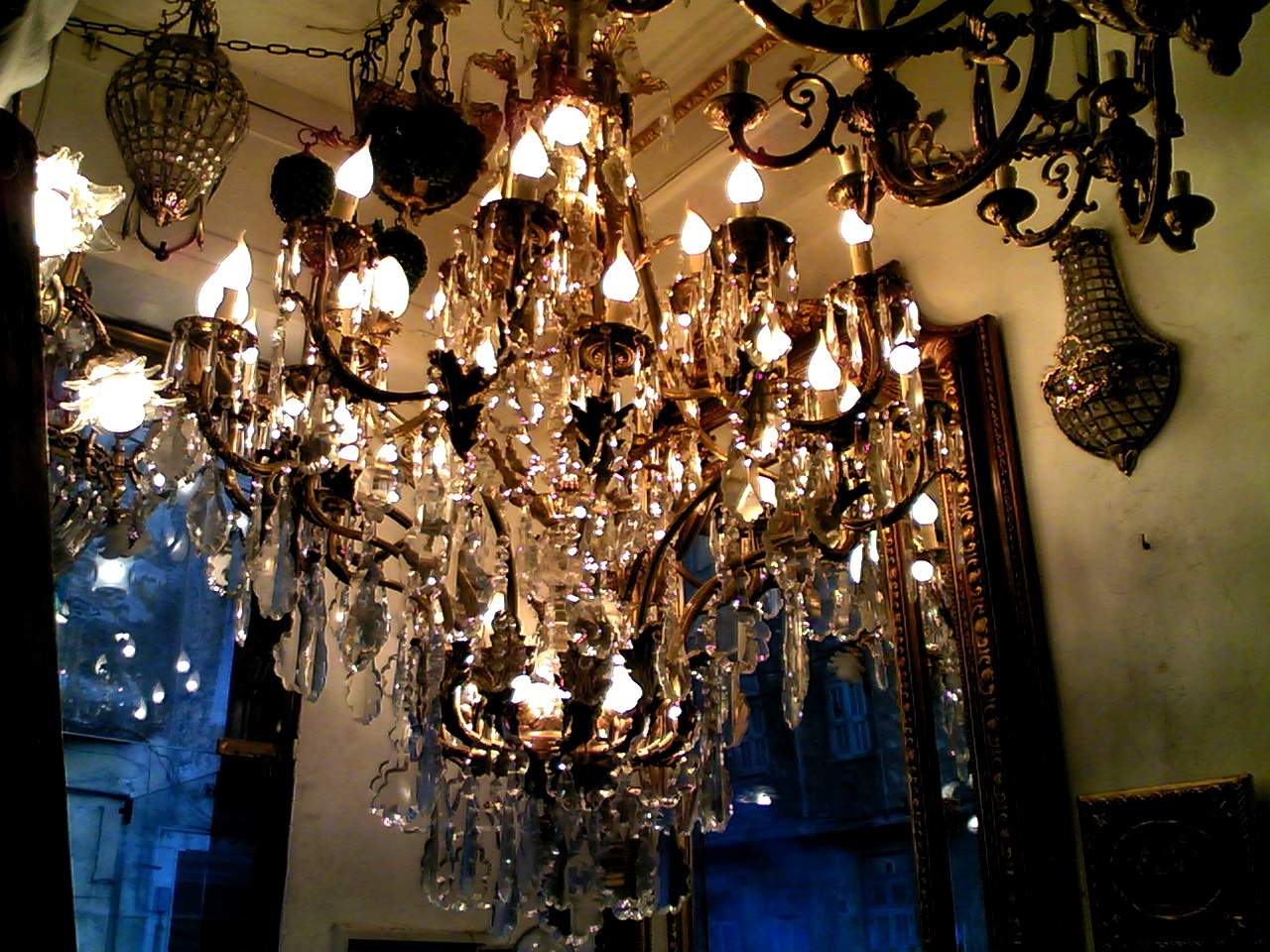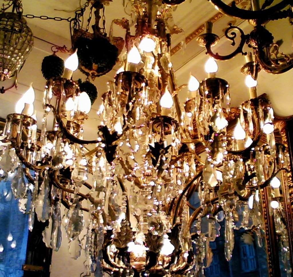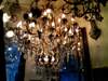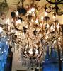 Imperial large crystal and patinated crafted copper 42 light chandelier ornamented with French pendant crystals, u-drop crystals and a glass globe.