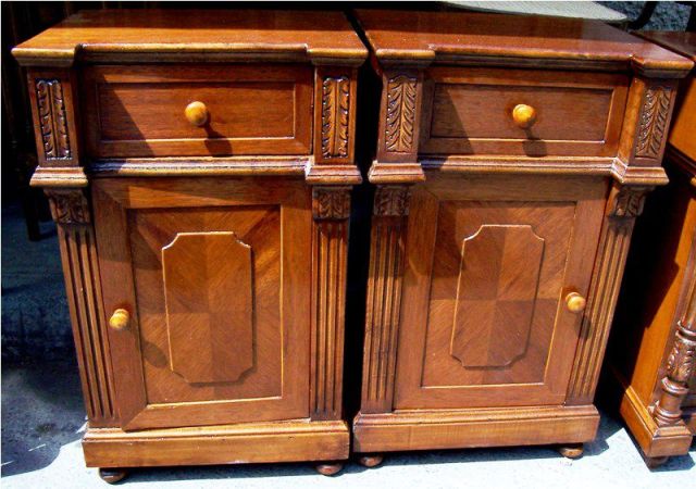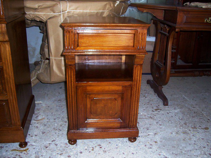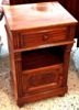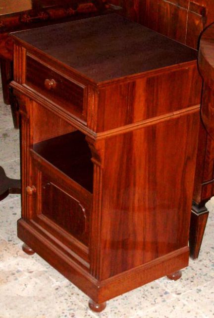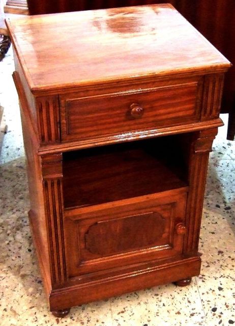 English style commodino / bedside commode, finished in english brown, with one drawers, one door and book space, with fluted carvings and wooden bun handles, raised on bun feet.