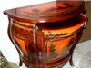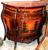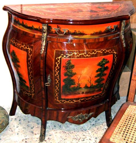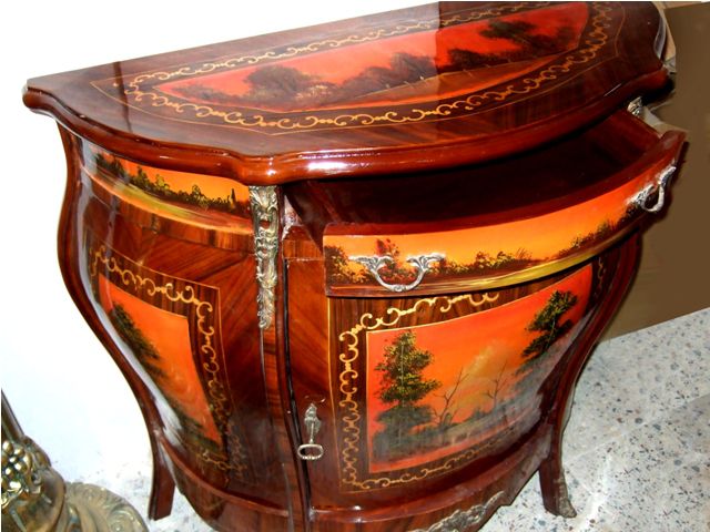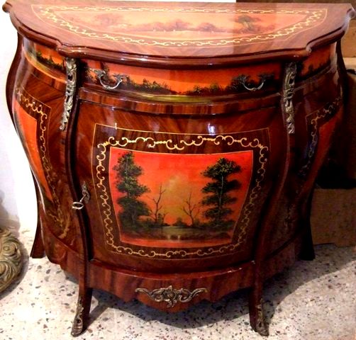 French Vernis Martin Style bombé painted commode, one drawer and one door houses one shelf, veneer inlaid with touch of marquetry, hand painted with natural scenes on top, door panel and sides, ornamented with aged ormolu mounts.