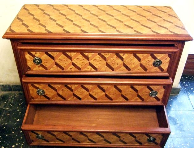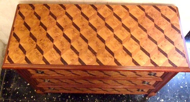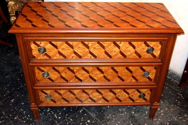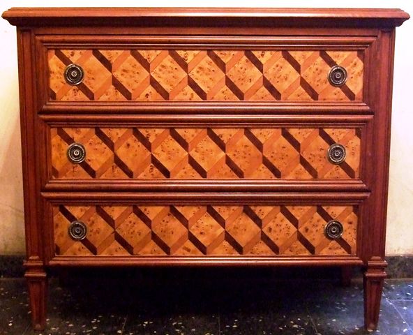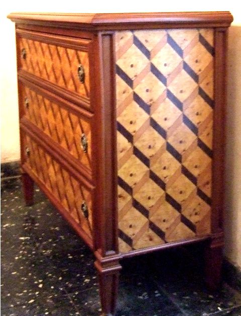 North Italian Louis XVI period style chest of drawers, finely inlaid with sans traverse herringbone pattern on top, sides and the three frieze deep drawers. REF: A683