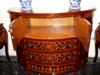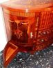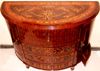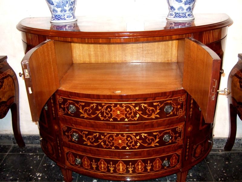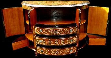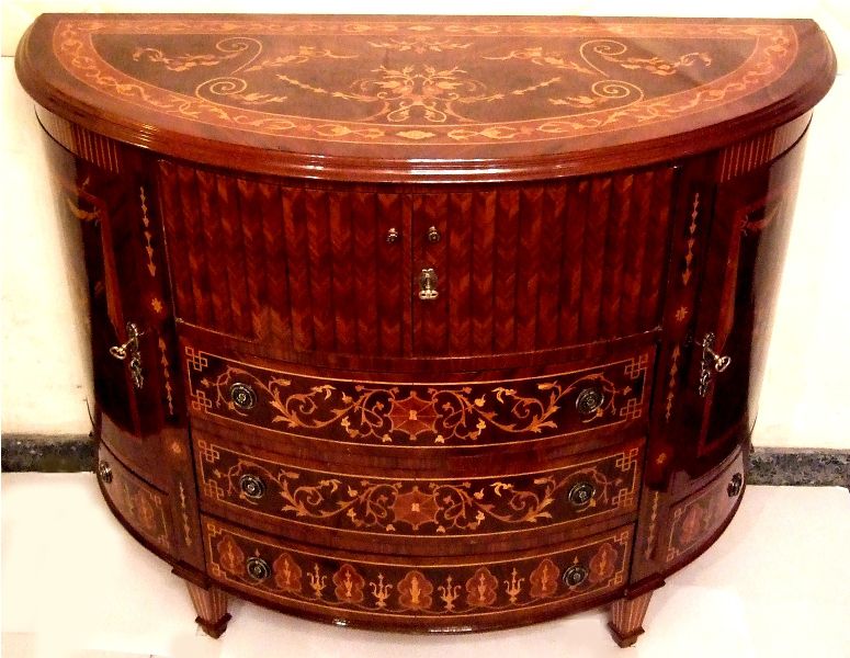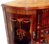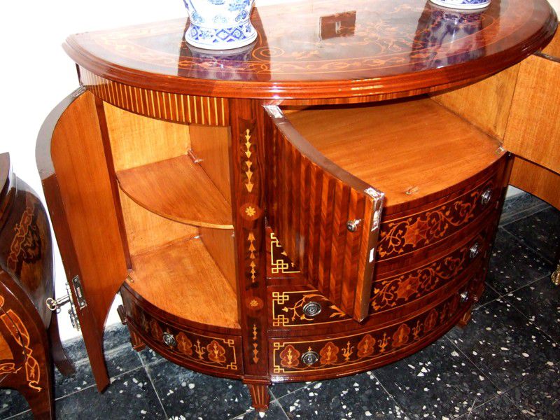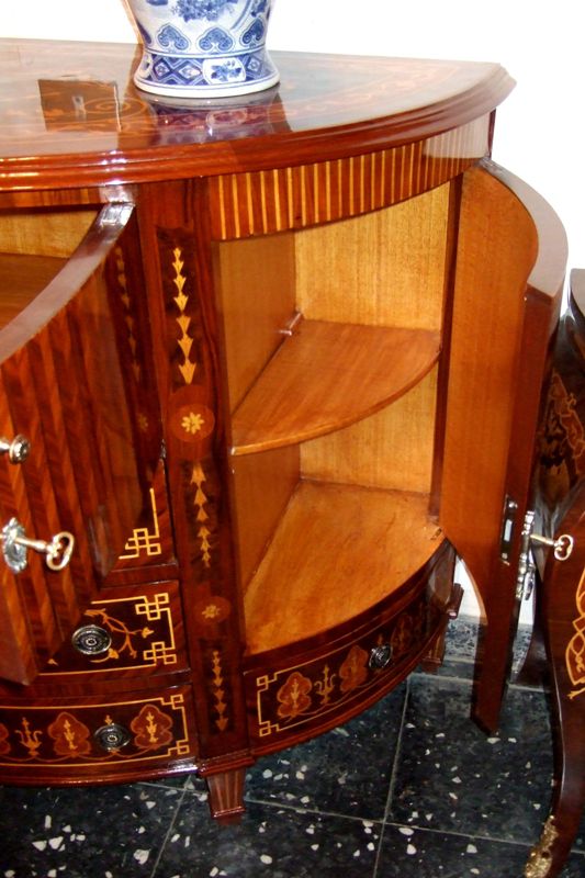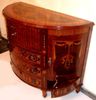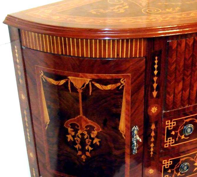Transitional Louis XVI manner extensive marquetry demi-lune shape side buffet, full of sans traverse foliate marquetry motifs and veneers, with four doors with shelves and five drawers.