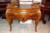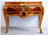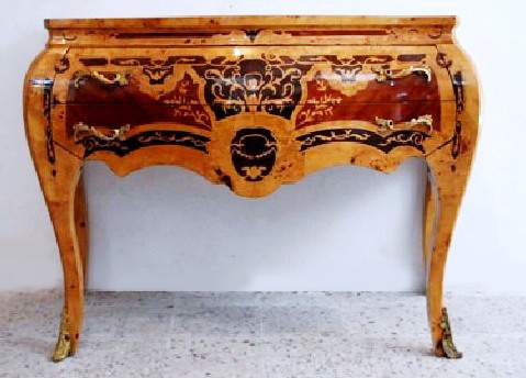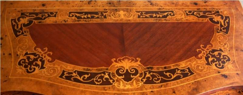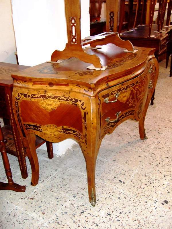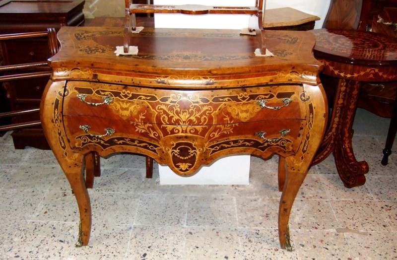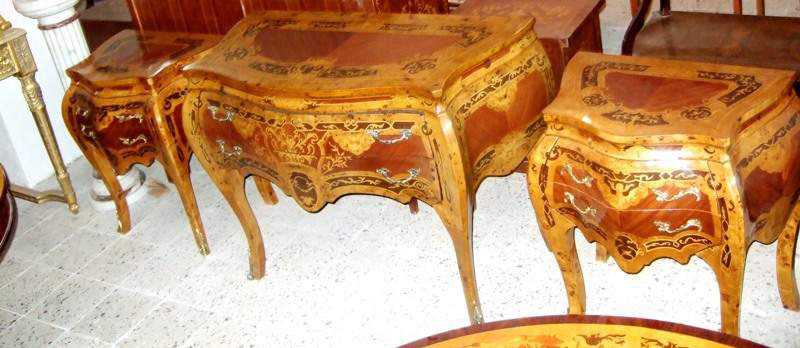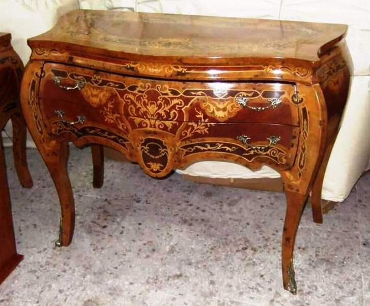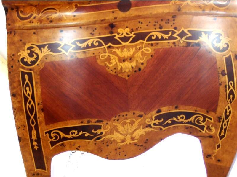 Different, French Louis XV style two drawers commode inlaid with beautiful sans traverse foliate marquetry motifs and various kinds of veneers like olive root veneers and apple root veneers as an example, ornamented with foliate ormolu handles, foliate side mounts and sabots and raised on splayed capriole legs. Offered for commode set with two bedside tables.