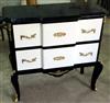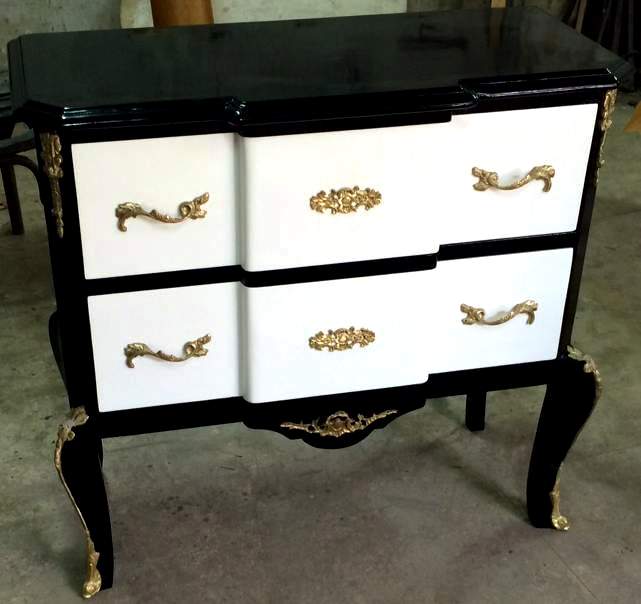 Louis xv style ormolu mounted side chest and Lady Desk, painted in black and white, with two drawers and a pulled out sliding writing panel, on a breakfront, ornamented with foliate ormolu handles, foliate ormolu mounts and raised on capriole legs ornamented with engraved ormolu strips terminating with foliate ormolu sabots.
