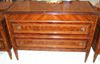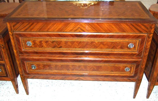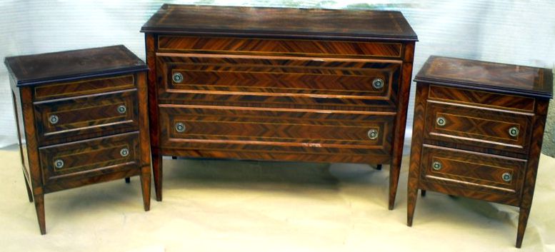 Italian Louis XVI period style , chest of drawers set of three pieces, a large chest and pair of commodinos, with two frieze drawers to each, inlaid with sans traverse cut veneer inlays in dark veneer bands and raised on square tapering legs.