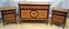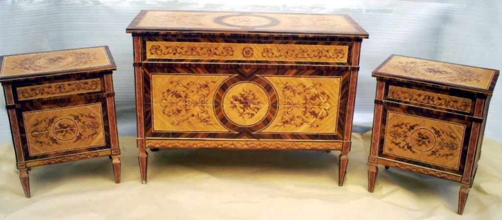 Italian Louis XVI, Neoclassical style Lombardy manner chest of drawers set of three pieces, a large commode and pair of smaller comodini, of three different size frieze drawers to each, inlaid with delicate sans traverse veneer and foliate marquetry motifs, conforming foliate swags centered by a circular medallion inset with foliate motif, all raised on square tapering legs.
