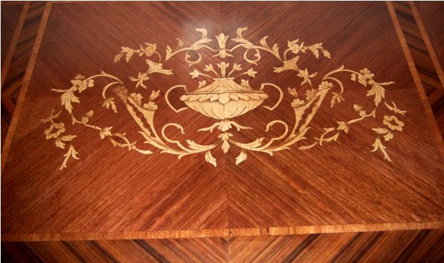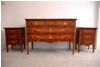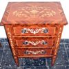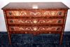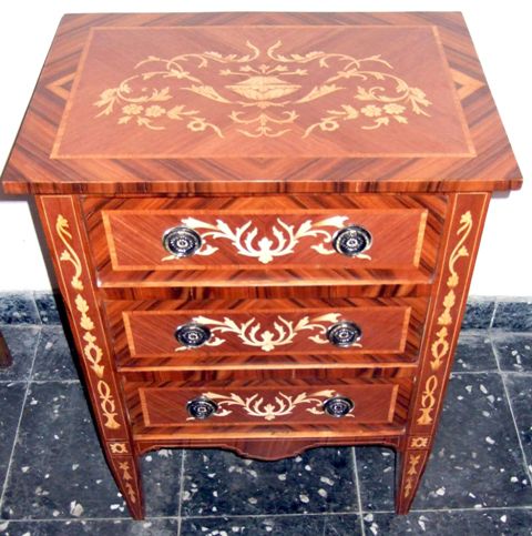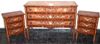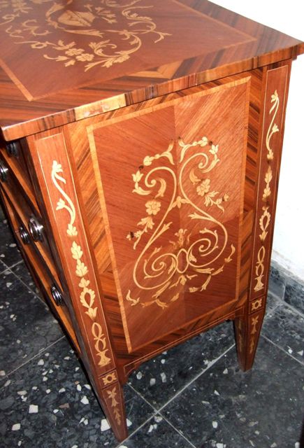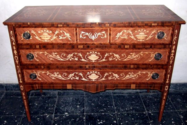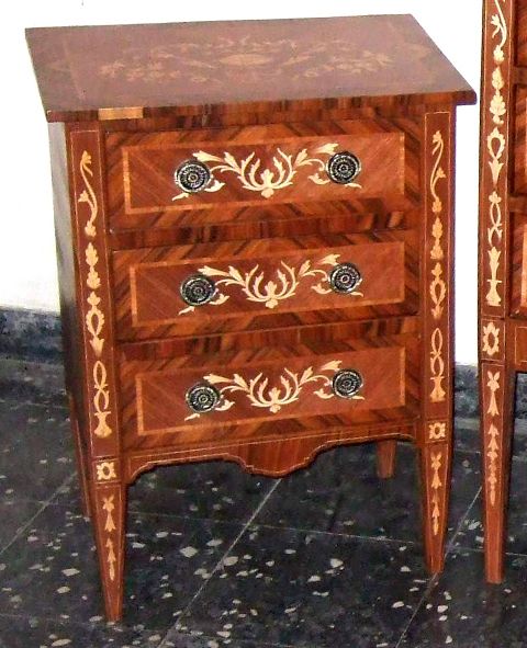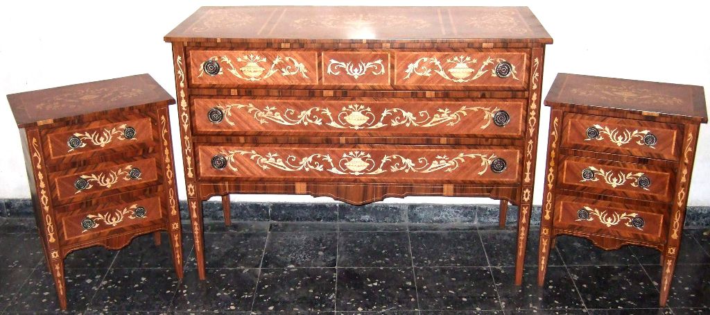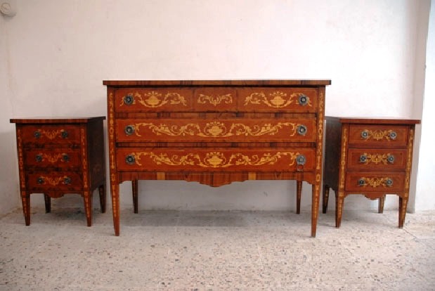 Italian Louis XVI, Neoclassical style chest of drawers set of three pieces, a large commode with four drawers and pair of smaller comodini with three drawers, inlaid with conforming sans traverse and quarter veneer inlays, Neoclassical urns emerge sans traverse foliate marquetry motifs and swags on all sides and raised on square tapering legs.