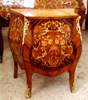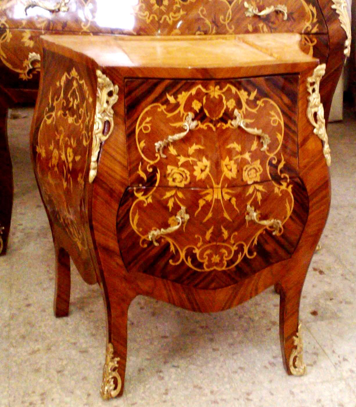 French style bombé baby commode with two drawers, marble top, veneered and inlaid with foliate marquetry motifs, with foliate ormolu handles, acanthus ormolu mounted sides and ormolu sabots. Extra ormolu to be added per request.