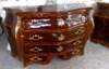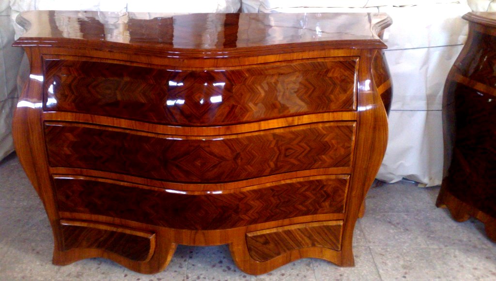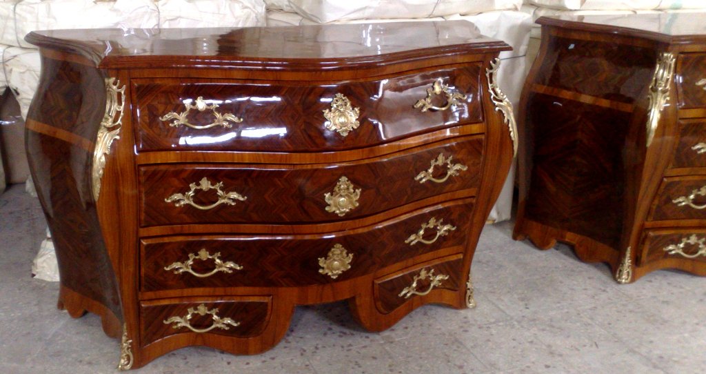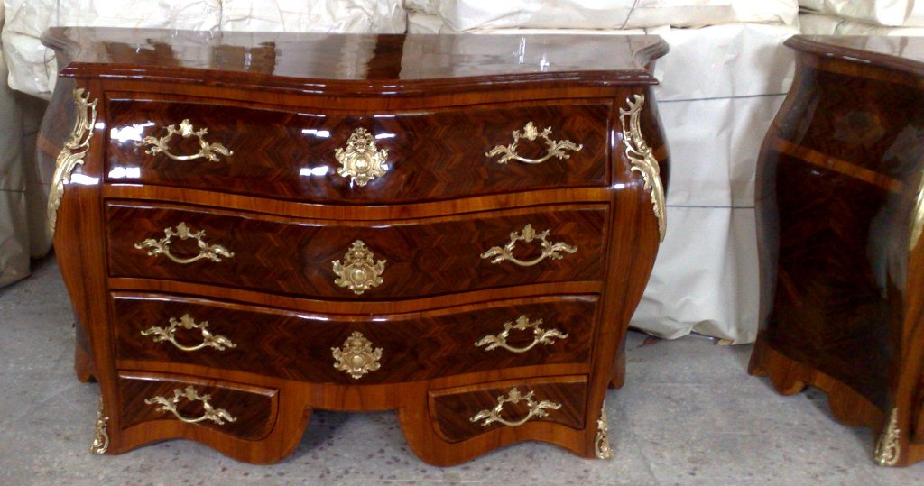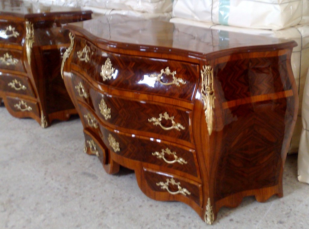 French style curved bombe(é) large commode, on the manner of François Mondon, with five drawers, inlaid with two types of veneers, highly shiny finished in two brown coloring degrees with foliate ormolu handles, ormolu cartouches, and cornered with ormolu acanthus ornamentations, the base legs are decorated foliate ormolu sabots.