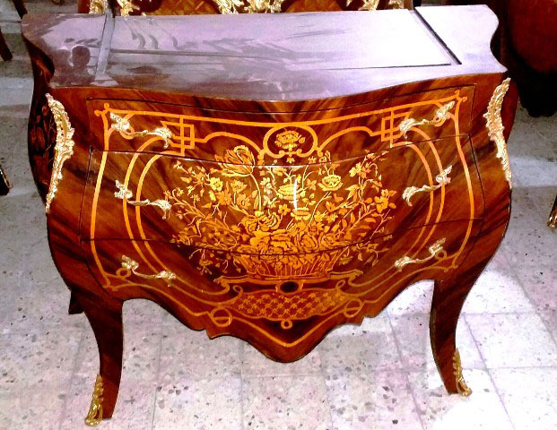 French Louis XV style bombe (curved) commode, veneered, with marble top, three drawers with foliate ormolu handles and foliate bouquet of marquetry patterns on front and sides, with ormolu foliate corners and foliate ormolu sabots.
