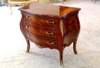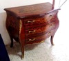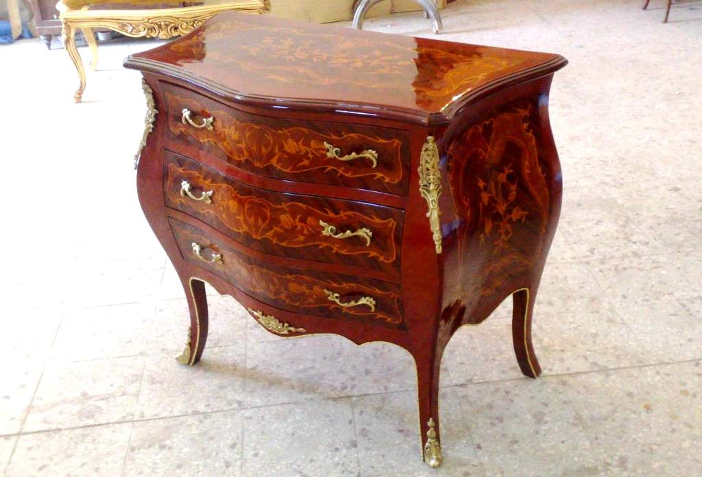 French Louis XV style bombe curved commode, with three drawers. inlaid with sans traverse palisander veneers and foliate marquetry patterns on top, sides and drawers, ornamented with foliate ormolu handles and framed with engraved ormolu strips and beautiful foliate ormolu mounts on corners and central lower part, raised on cabriole splayed legs covered with foliate ormolu sabots.