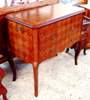 Delicate French Louis XV style commode with four drawers, two small drawers on sides and two large drawers in front, inlaid with partitioned sans traverse veneer pattern, and stands on cabriole legs.