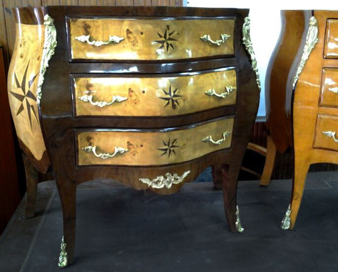 Three drawers, veneer inlaid bombé curved ormolu mounted commode, with marble top. REF: A642