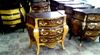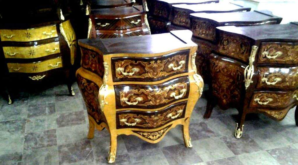 Three drawers side galbee style ormolu mounted commode, marble topped, ornamented with beautiful sans traverse veneer inlays and raised on splayed legs covered with ormolu cast sabots.
