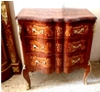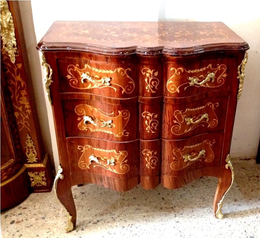 French Louis XV style wave front commode with three drawers, inlaid with veneers and foliate marquetry motifs, ornamented with foliate ormolu handles, foliate ormolu corners and ormolu sabots on cabriole legs.