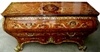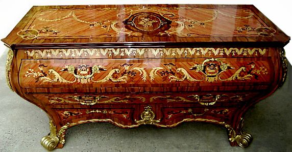 French Louis XV ormolu-mounted bombé shape large chest, inlaid with veneer and extensive foliate marquetry motifs on all sides, two large drawers and other two smaller drawers in the lower section, flanked with ormolu mounts, ormolu cartouche in the central lower section, and raised on splayed legs ornamented with foliate ormolu-cast paw sabots.