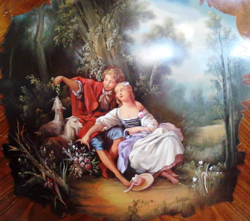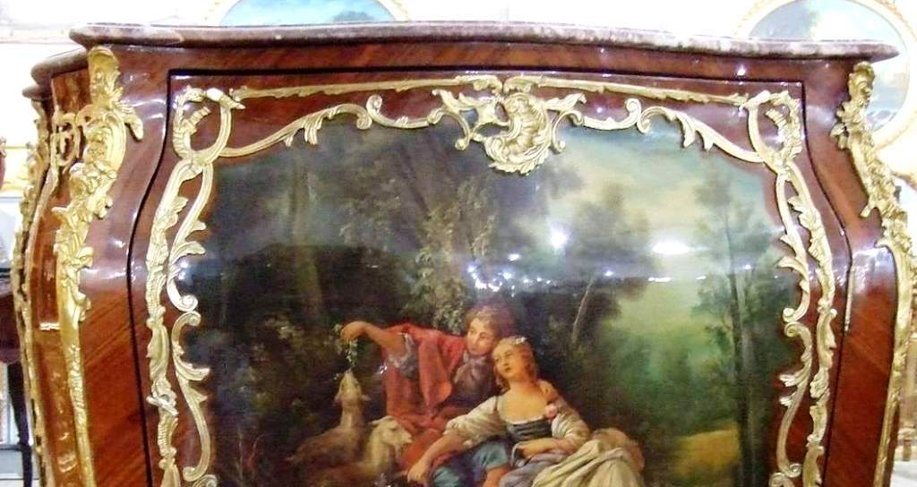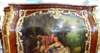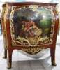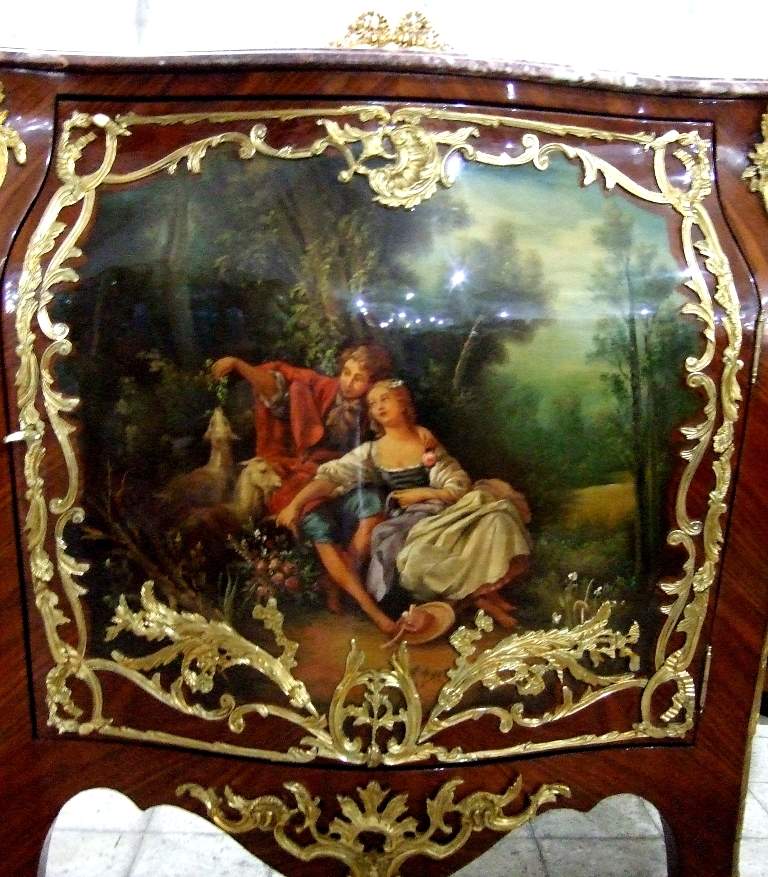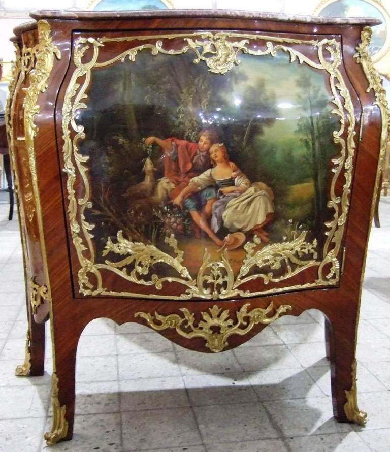 French Louis XV and Vernis Martin style side cabinet in galbee shape, veneered, with marble top and one door, the panel is hand painted by our artists with a fine painted romantic court scene, ornamented with foliate ormolu encadrement on front and sides, with delicate foliate ormolu ornamentations of shells, acanthus leaves, swags and garlands on the manner of Francois Linke style, the cabinet is raised on semi splayed legs with foliate-cast sabots.