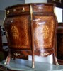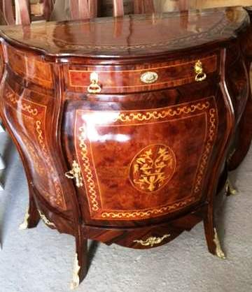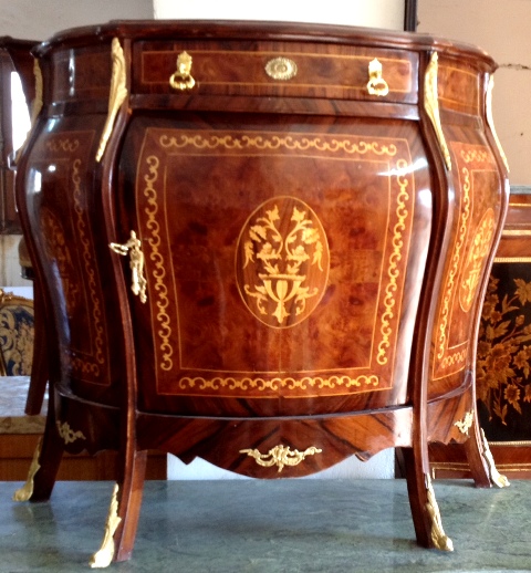 French style bombe (curved) commode, with one drawer and one door houses one shelf, inlaid with veneers and marquetry and ornamented with ormolu mounts.