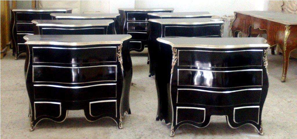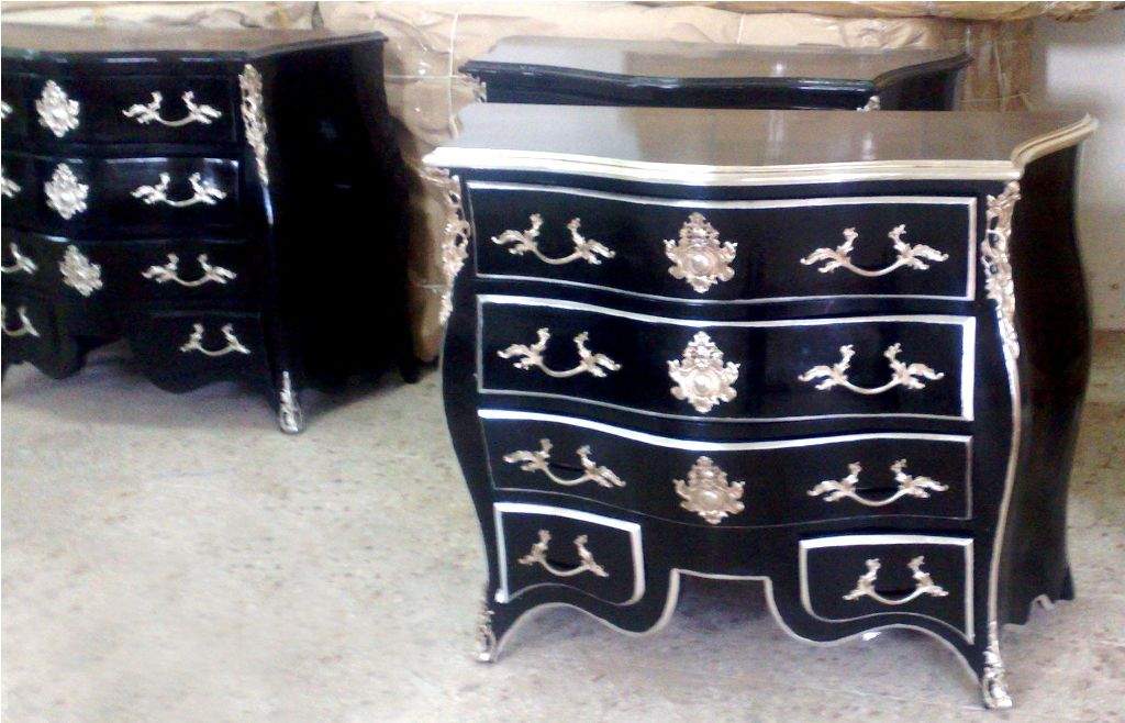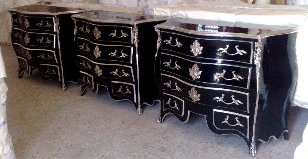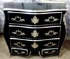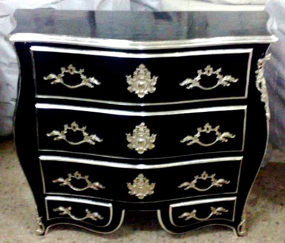 French Louis XV style curved serpentine shape molded top commode, painted in black and silvered on edges with French silver foils, ornamented with foliate silvered ormolu handles, silvered ormolu cartouches, silvered ormolu foliate mounts on corners, foliate silvered ormolu sabots, with three large drawers and two smaller drawers in the lower section.
