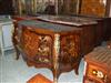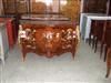Large Louis XV style commode with three drawers, with marble top, inlaid with veneers and foliate marquetry patterns, foliate ormolu handles, cornered with ormolu acanthus leaves sides, elongated and terminated with ormolu foliate sabots.
