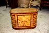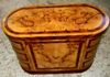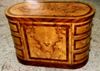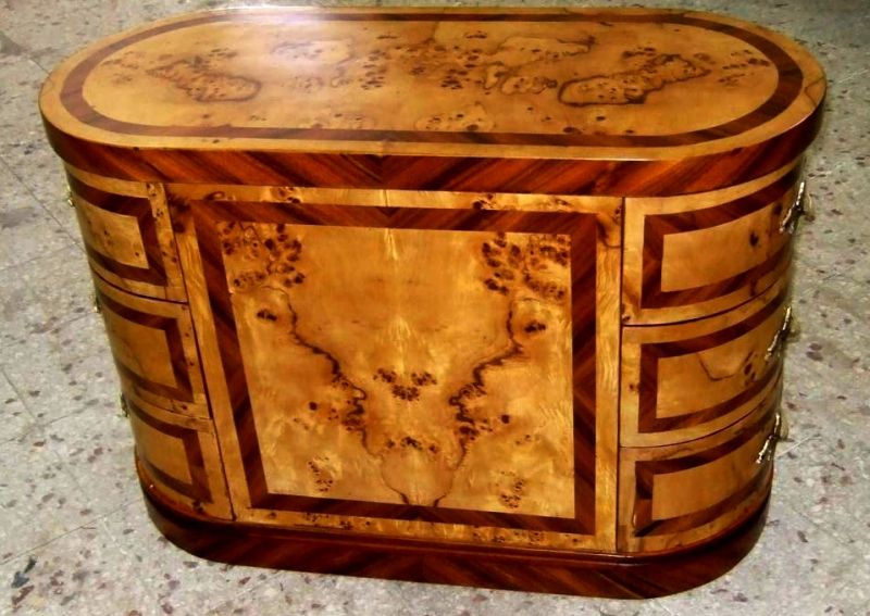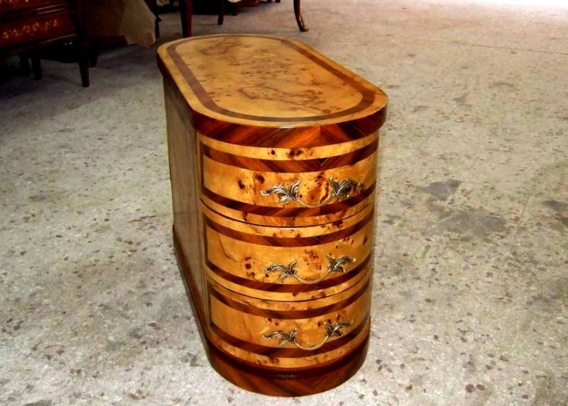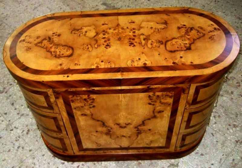 Distinct handmade chest of drawers finely inlaid with sans traverse precious apple root veneer and darker palisander veneer bands on top, base, sides and drawers, with six deep drawers, three to each side, ornamented with foliate ormolu handles.