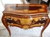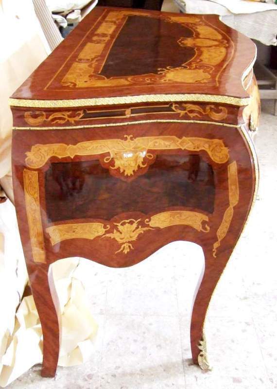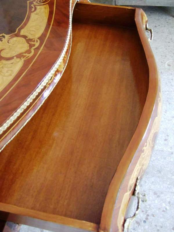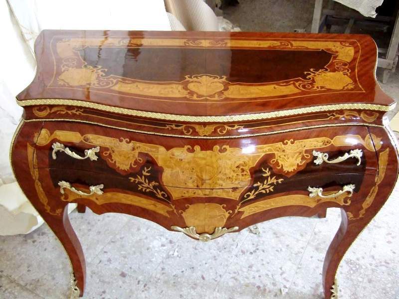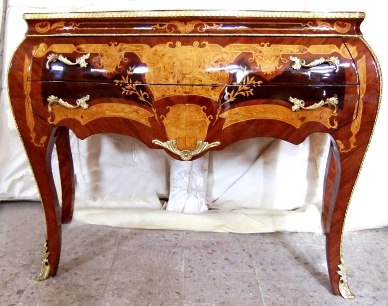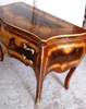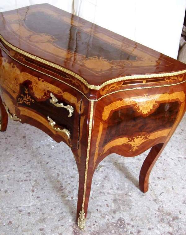 French Louis XV style commode, two drawers, inlaid with beautiful sans traverse foliate marquetry motifs and veneers, ormolu bands on frieze, sides and body, foliate ormolu handles, ormolu mounts and sabots and raised on splayed capriole legs.
