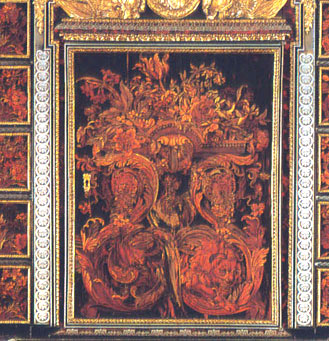 The central door is decorated with a panel of marquetry showing the cockerel of France standing triumphant over the lion of Spain and the eagle of the Holy Roman Empire.