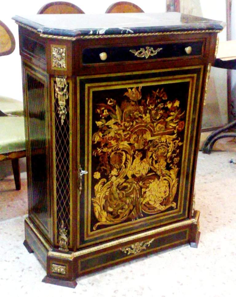 17th century, Napoleon III style marquetry and veneer cabinet, on the manner of ébéniste André-Charles Boulle, with one drawer, one door and veined marble top and fine ormolu fittings. The cabinet is raised on a plinth base.