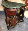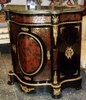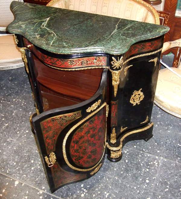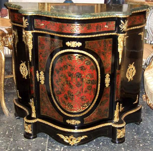 A French Napoleon III and Boulle style serpentine shape gilt-ormolu, ebonised, inlaid red tortoiseshell and cut brass side cabinet after the model of the late 19th century, Inlaid overall with foliate strapwork with a moulded veined marble top above a frieze drawer and cupboard door enclosing one shelf, engraved ormolu bands, the angles, front, sides ornamented by foliate ormolu mounts and cartouches.
