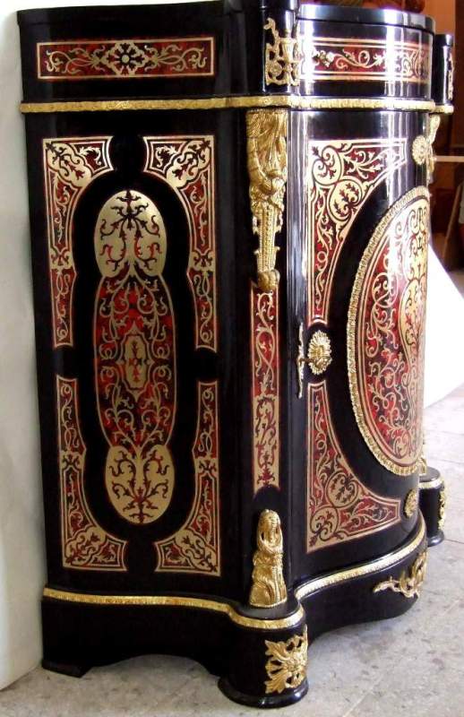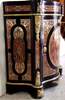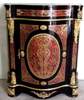 Napoleon III and Boulle style serpentine outshape ormolu mounted cut-brass-inlaid red tortoiseshell and ebonised Meuble D'appui, decorated overall with scrolled arabesques with one drawer and cupboard door enclosing one shelf, engraved ormolu bands, the corners and front ornamented by foliate acanthus ormolu mounts and cartouches.