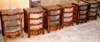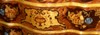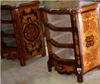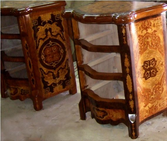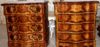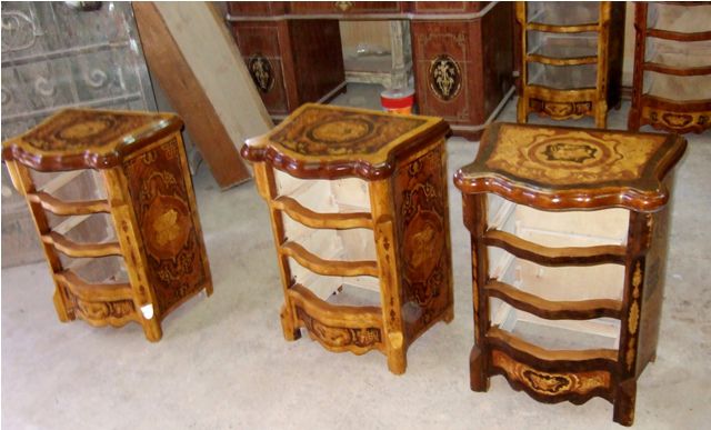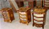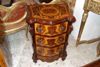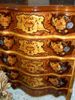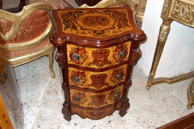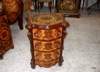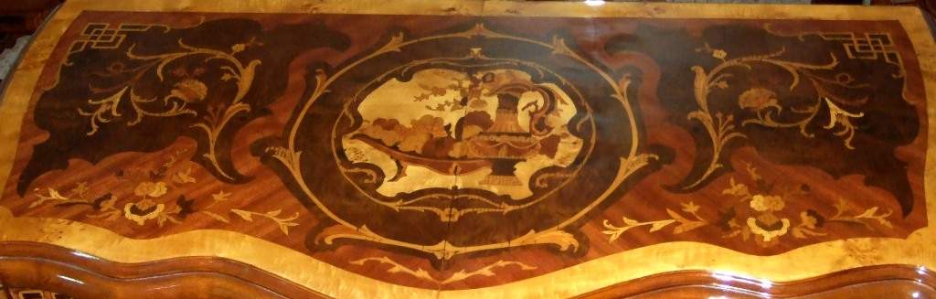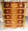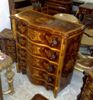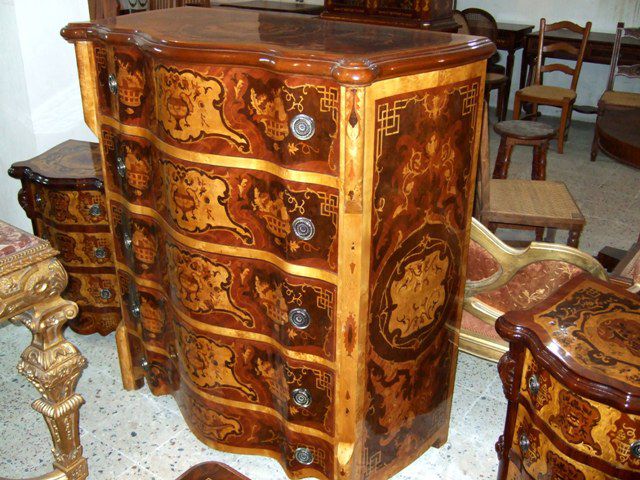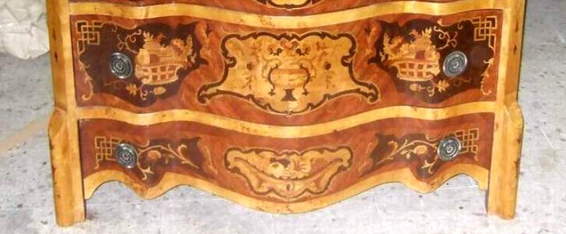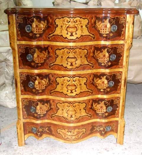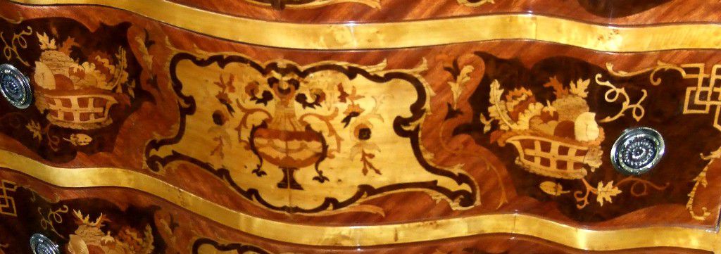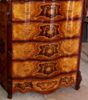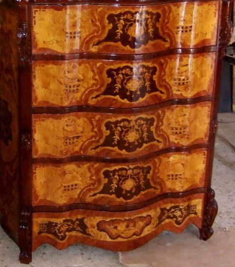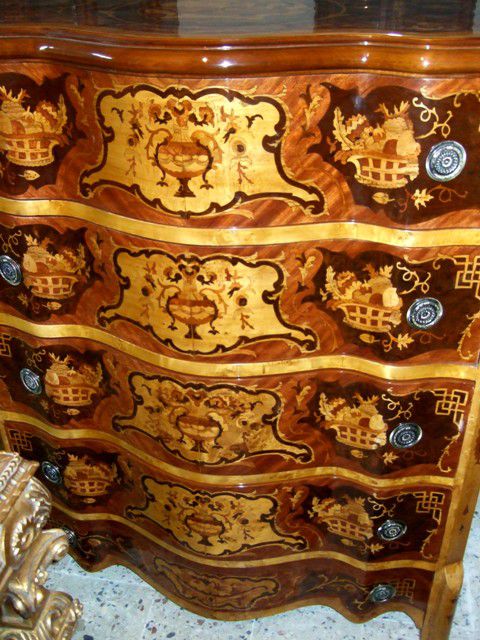 A unique extensive marquetry serpentine shape eared top chest of drawers set, of a five drawers semainier and three drawers pair of commodinos, fully inlaid with different veneers and marquetry motifs of flowers, fruit baskets, urns and ewers, bands, cornucopia, sans traverse trellis, medallions on top, front and sides.
