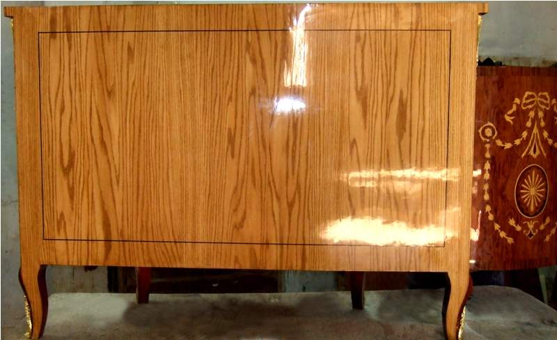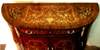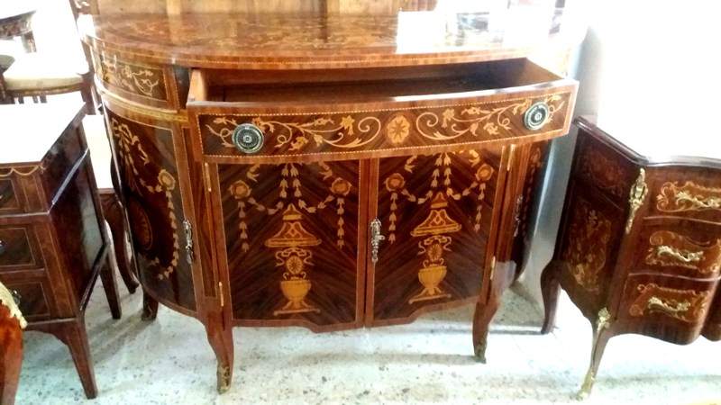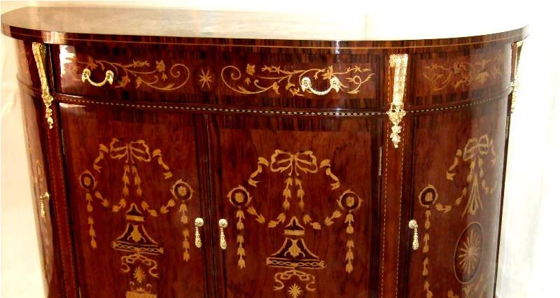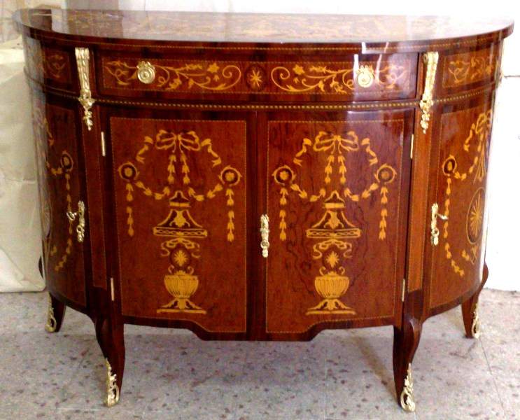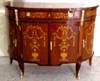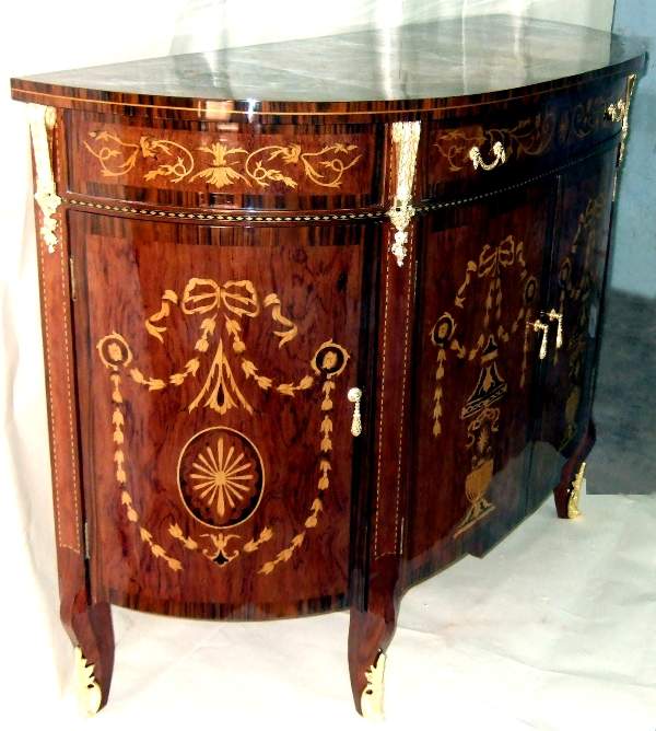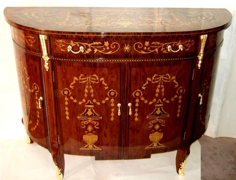 French Louis XV style Bahut, highly finished inside out, inlaid with mahogany veneer, with one large drawers, two doors on sides with two shelves each and central two doors contain one shelf, ornamented with stunning marquetry patterns on top, front and sides representing scrolling hanging foliage medallions, trellis and urns, and delicate beautiful gilt-ormolu mounts. Offered in different finishing styles.