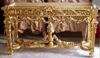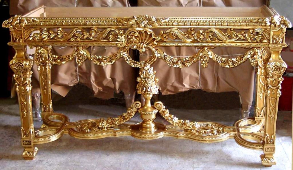 Finely carved and gilded Louis XIV Rococo style giltwood console table, finished in pure gold with French gold foils and inset marble top, ornamented with wattles, trellis, c-scrolls, foliate pendants, swags, cartouches, beaded frieze, garlands, scalloped works, laurel wreath, pierced apron on tapering legs joined by an entwined seeded stretcher with burgeoned leaves and flowering urn.