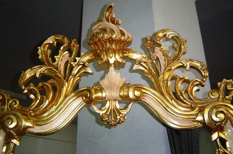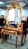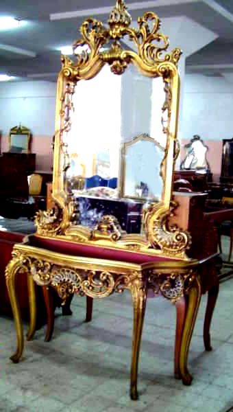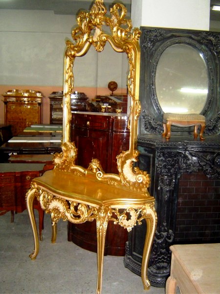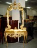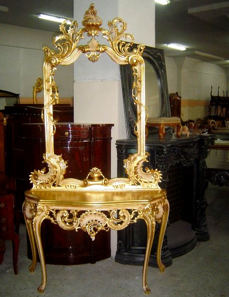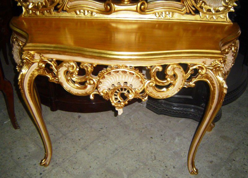 French Louis XV Style console with mirror, exquisitely carved and gilded with french gold foils, offered in different finishing, gilding with silvering and gilding with coloring, per request, wooden top or marble top per request, decorated with sea shells, scrolls, garlands, vases and delicate cabriole legs.