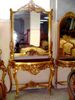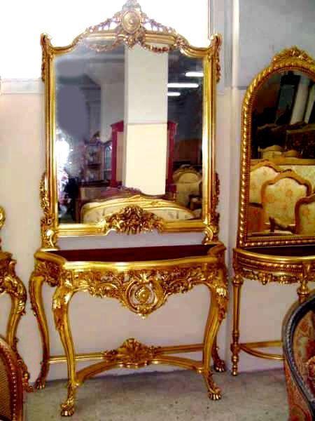 French Louis XV style carved and gilded console with mirror, marble topped, carved with foliate scrollwork motifs, cartouche and foliate pendants, pierced c-scrolled apron on cabriole legs joined by x-stretcher with sea-shell.