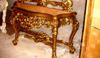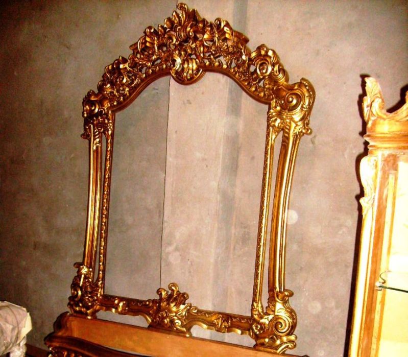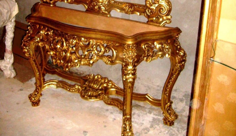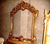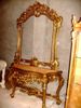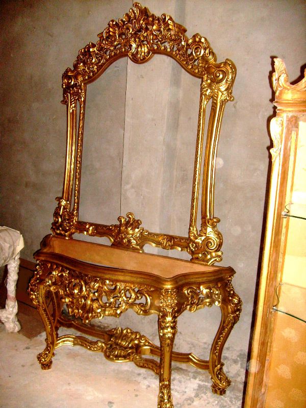 French Louis XV style carved, gilded and patinated entryway console with mirror, marble topped (not illustrated), finely carved in rocaille style with c-scrollwork, foliate motifs, pierced mirror frame and apron on carved cabriole legs joined by scrolled stretcher centered with foliate sea-shell.