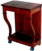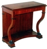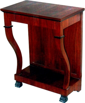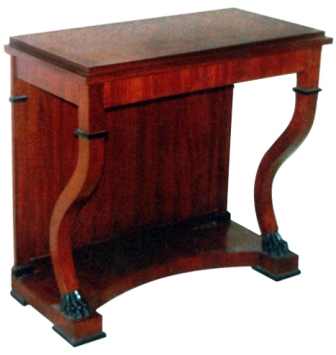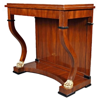 A Restauration style veneer inlaid mahogany finish console table in the manner of the English cabinet-maker George Smith, who worked in Naples in the early decades of the 19th century, producing his own individual version of the Empire & Restauration styles, the rectangular top apron above an ebonized paw-footed cabriole front legs and a wooden back on a concave plinth, the smaller size rest on an ebonized paw footed rectangular plinth.